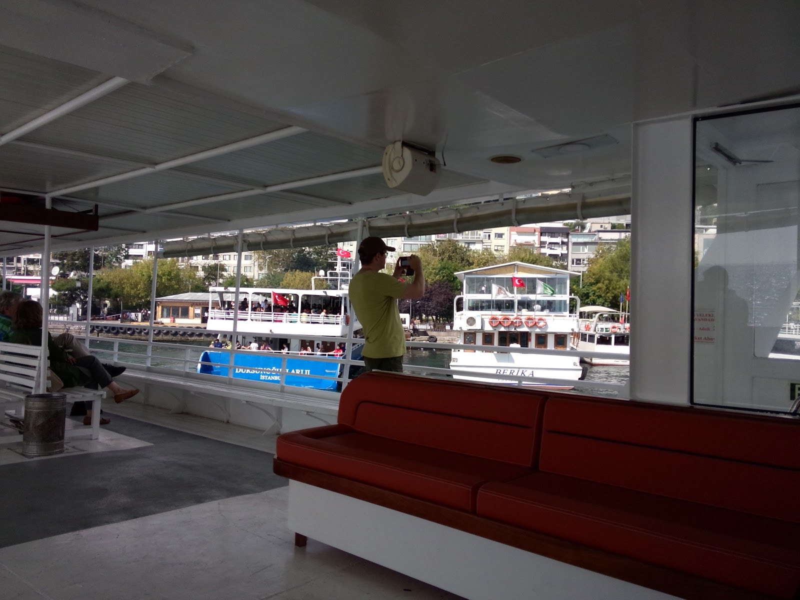 Внутри есть бар с горячим чаем и закусками, в некоторых теплоходах видела и кондиционеры и обогреватели (в Стамбуле летом очень жарко, выше 40*С, а зимой бывает и снег, так что на Босфоре очень холодно бывает).